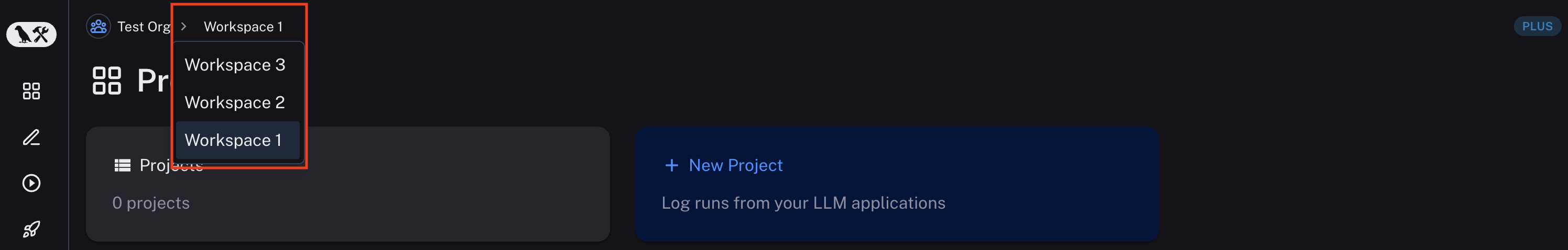 Once you’ve subscribed to a plan that allows for multiple users per organization, you can set up workspaces to collaborate more effectively and isolate LangSmith resources between different groups of users. To navigate between workspaces and access the resources within each workspace (trace projects, annotation queues, etc.), select the desired workspace from the picker in the top left: